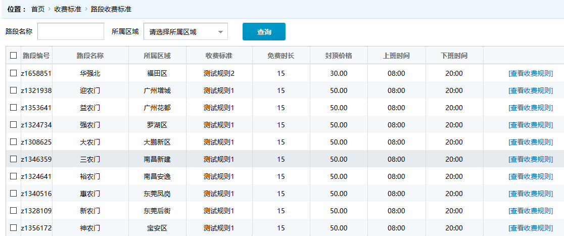 ●路段收費標準:根據(jù)系統(tǒng)添加的路段,對應的收費標準記錄,可點擊“查看收費規(guī)則”了解收費標準的明細,每個路段可以執(zhí)行不同的收費規(guī)則。