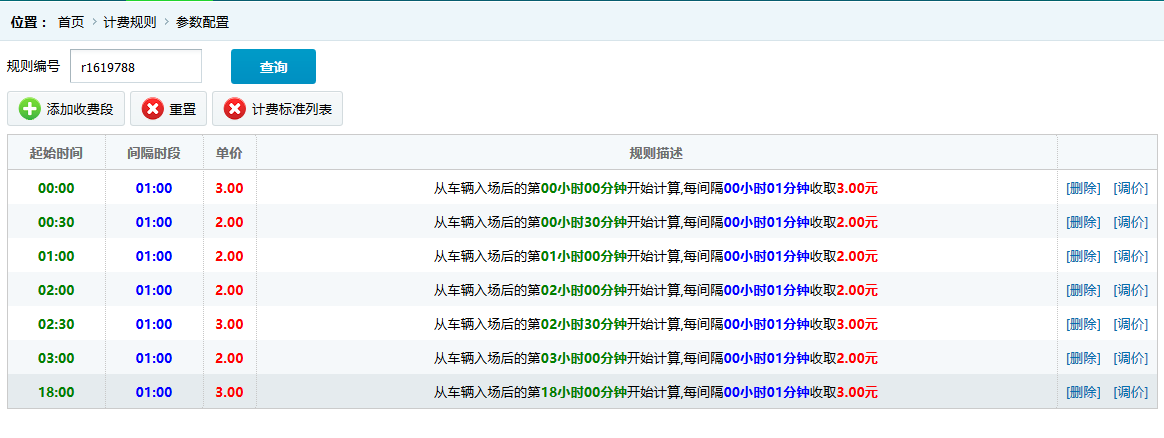 ●配置收費規(guī)則:設(shè)置收費標準中,按時段收費的規(guī)則明細,收費規(guī)則信息可更改,規(guī)則明細記錄可調(diào)整。