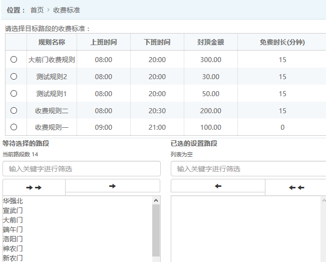 ●添加收費規(guī)則:在列表中可選中指定的收費標準,對應到多個路段中,如圖: