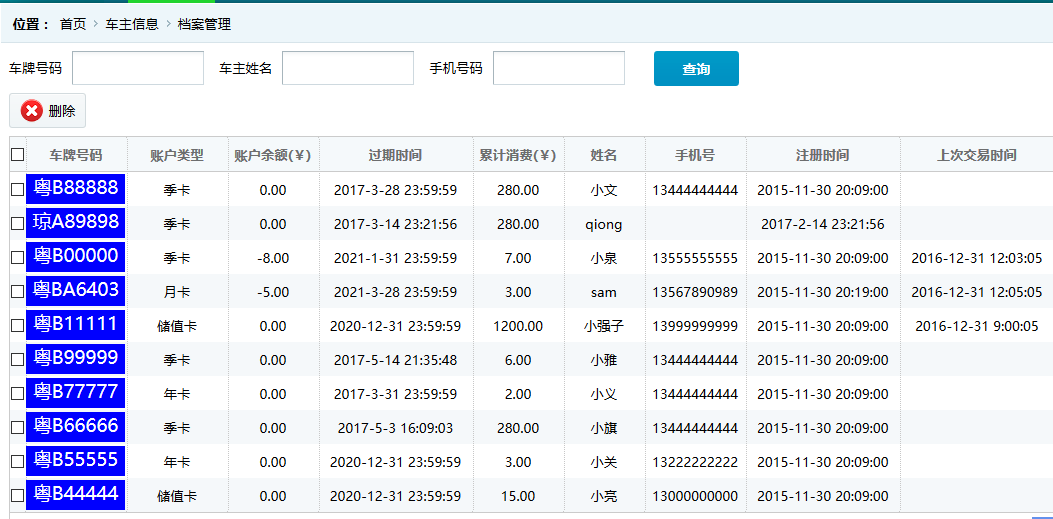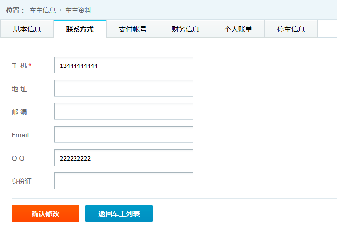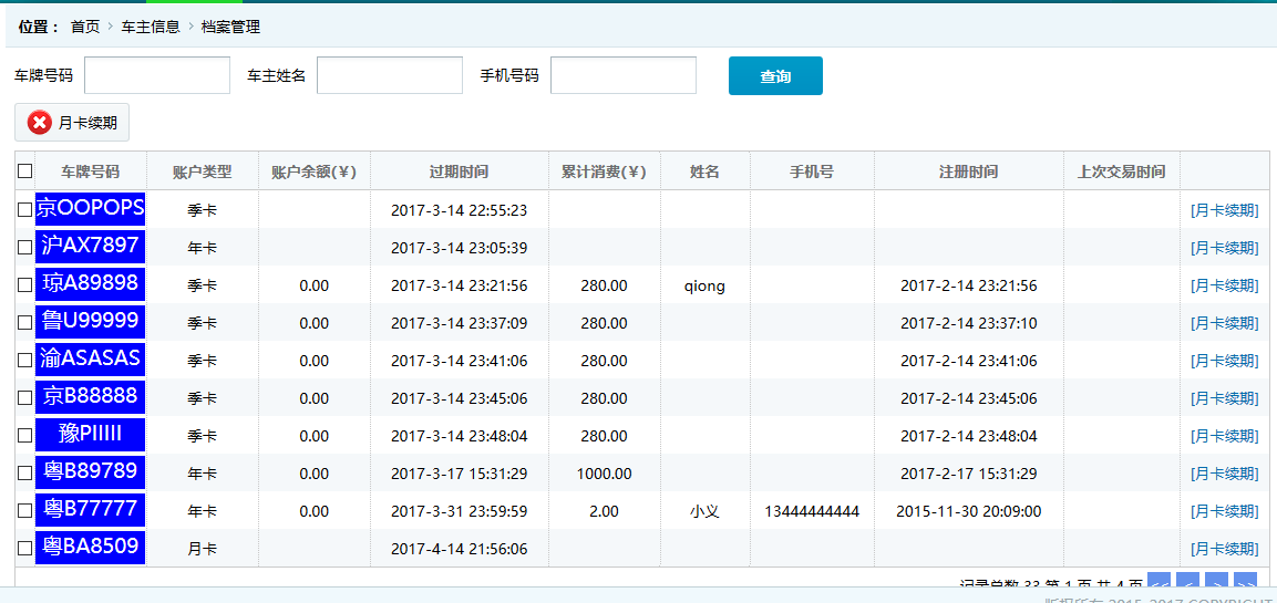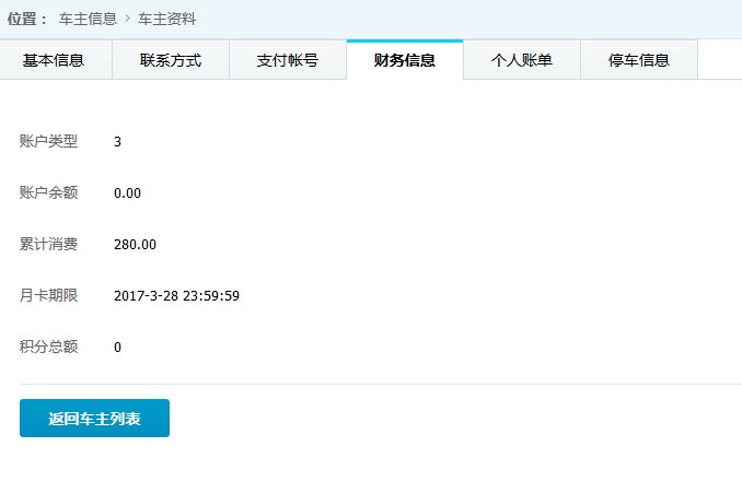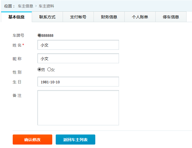●車主詳細信息 查看并維護車主的基本信息,旭歐科技系統(tǒng)中自動為進場停車的車輛建立會員賬戶,方便交費充值等服務。在此功能中,管理員可對車主詳細信息查看并修改,如下圖: