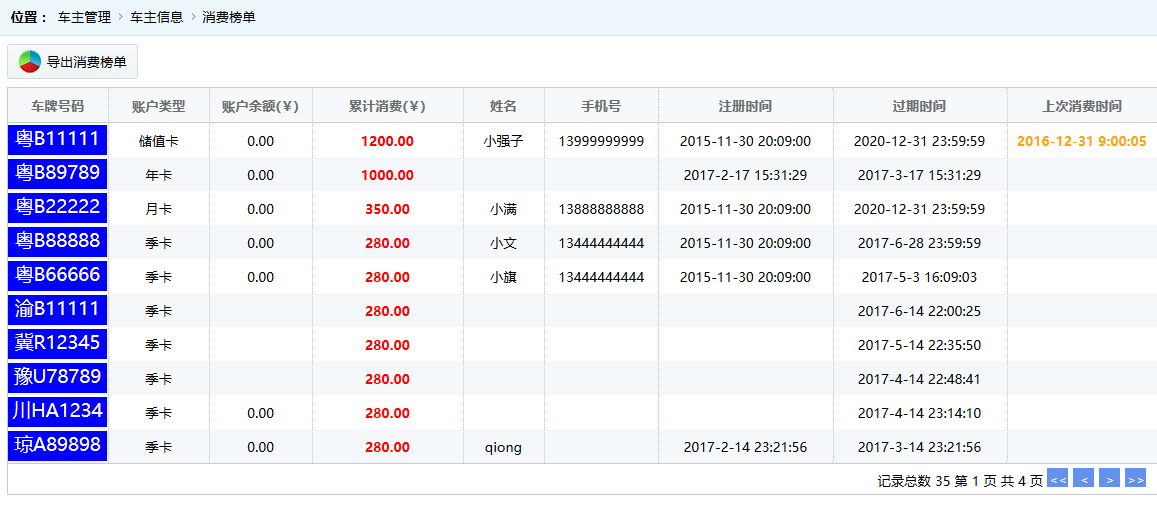 ●消費榜單 按照累積消費的總金額從大到小排序,默認顯示前幾位累積消費多的車主用戶。如圖: