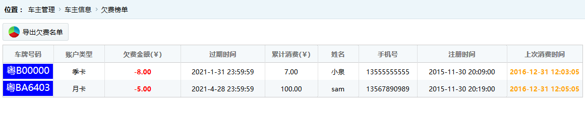 ●欠費榜單 按照累積欠費的總金額從大到小排序,默認顯示前幾位累積欠費多的車主用戶。如圖: