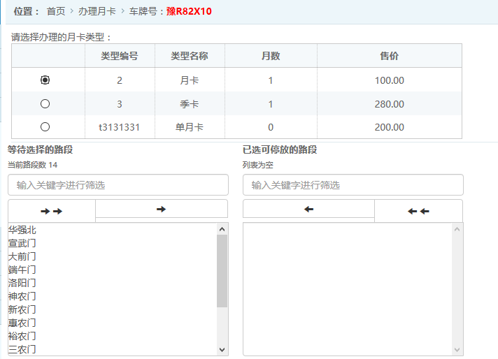 ●辦理月卡 輸入車牌號,辦理相應的月卡套餐,如圖: